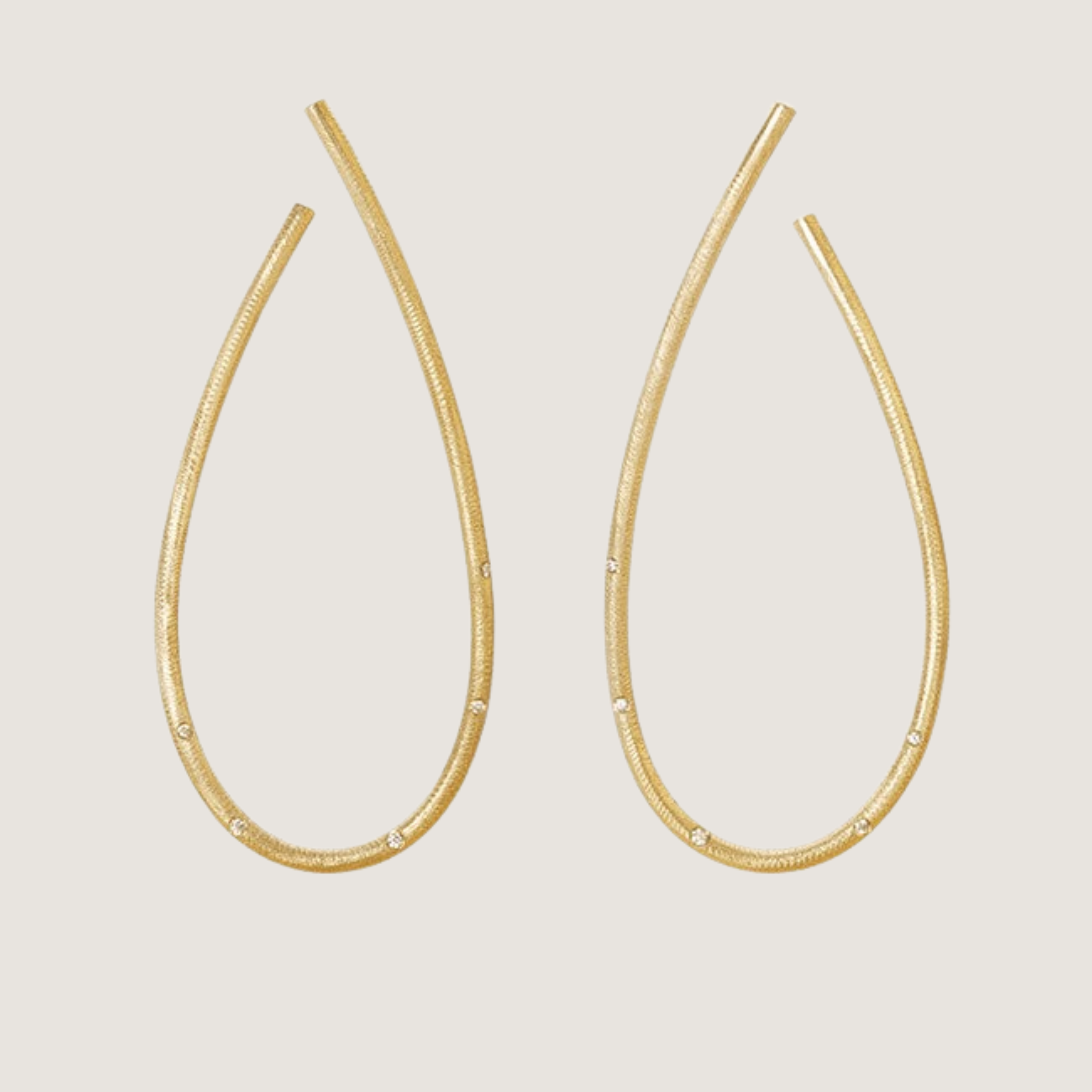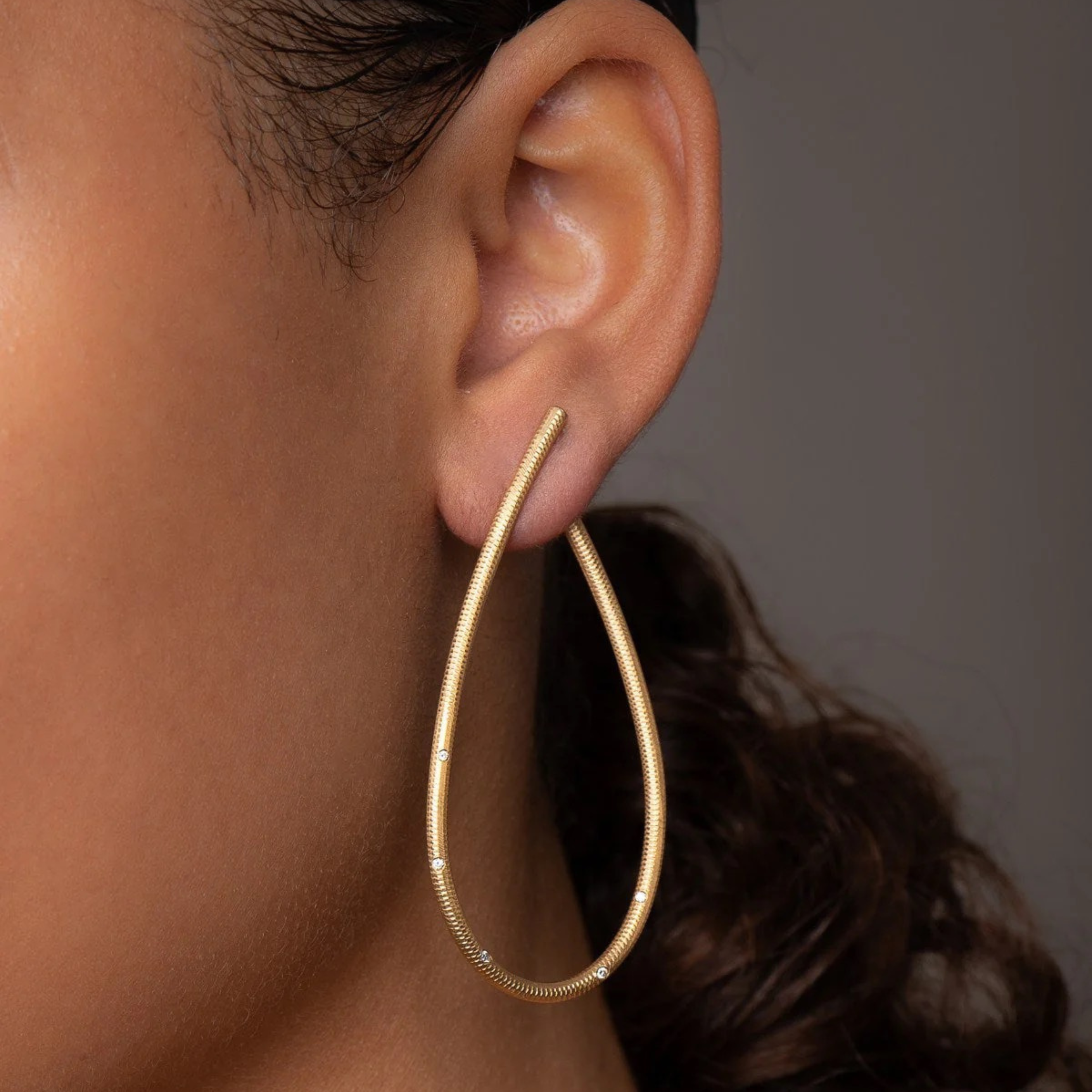 Størrelsen passer godt til kvinder med langt hår eller til særlige lejligheder, hvor smykkerne godt må vække opsigt, og er her isat 5 brillanter på hver ørering for at give et ekstra glamourøst udtryk. Bemærk at der er en højre og en venstre ørering og at de skal placeres, så kurven svinger væk fra ansigtet.